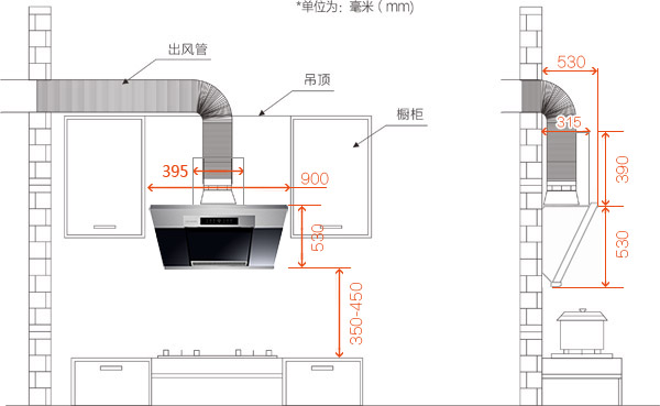 2、為方便煙機安裝,櫥柜需預留一定空間,在產品尺寸的基礎上,建議多預留30㎜
