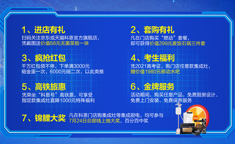 集成灶十大品牌、廚電行業(yè)十大品牌科恩燃動七月舌尖之旅——邂逅幸福美味,七大特權(quán)享不停,進店有禮:掃碼關(guān)注京東或天貓科恩官方旗艦店,憑截圖送價值68元無菌菜板一塊;套購有禮:凡在門店購買“燃動”套餐,即可獲得價值299元麥飯石鍋三件套;瘋搶紅包:千萬紅包領(lǐng)不停,下單滿3000元即可砸金蛋一次,6000元砸二次,以此類推;考生福利:憑2021高考證,購門店任意款集成灶,贈價值1980元移動水吧;高鐵旅惠:憑乘坐“科恩號”高鐵票,可享受指定款集成灶直降1000元特殊福利;金牌服務:活動期間購買任意產(chǎn)品,可享受免費廚房設計、免費上門安裝、免費保養(yǎng)服務;錦鯉大獎:凡在科恩門店購集成灶等集成廚電,均可參與7月24日總部線上抽獎。