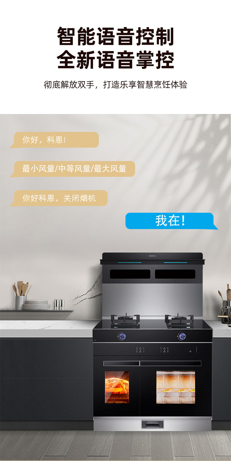 科恩集成灶本次新品發布最大的亮點在于S450左右蒸烤集成灶,隨著生活的不斷提高,節奏也在加快,對廚房的要求也越來越智能化、便捷化,廚房體驗更偏向于烹飪效果、使用體驗、效率提升以及智能操控,集成灶十大品牌、廚電行業十大品牌科恩S450集成灶滿足了現代化廚房需求。獨立空間,左右蒸烤,蒸出食材原先,烤出鮮嫩多汁,同時操作蒸烤同步,改變了以往蒸烤單獨進行的運轉模式。S450左右蒸烤集成灶還擁有智能語音控制,徹底解放雙手,打造樂享智慧烹飪體驗,