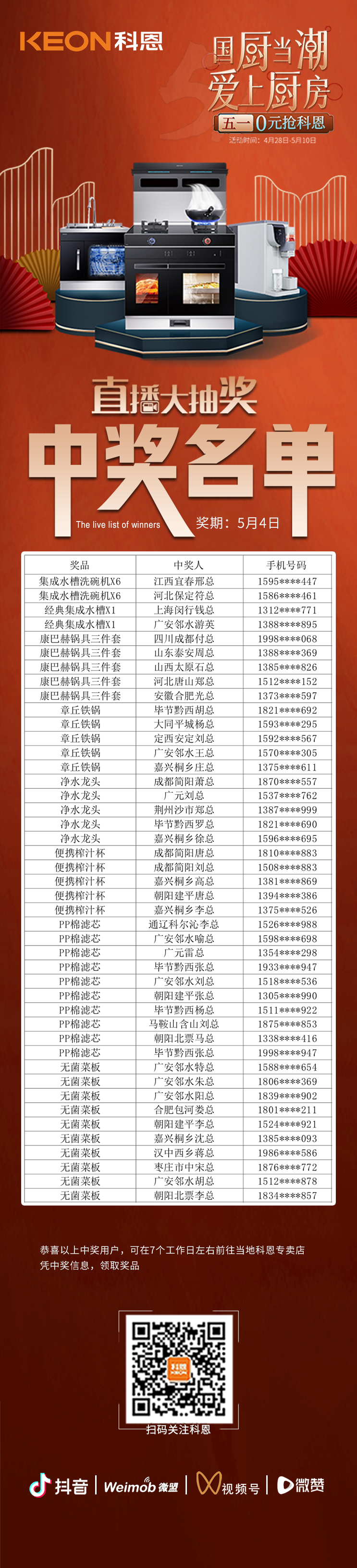 國(guó)廚當(dāng)潮,愛上廚房——0元搶科恩活動(dòng)正在火爆進(jìn)行中,為回饋消費(fèi)者,科恩電器特于5月4日晚舉行了直播大抽獎(jiǎng)活動(dòng)。