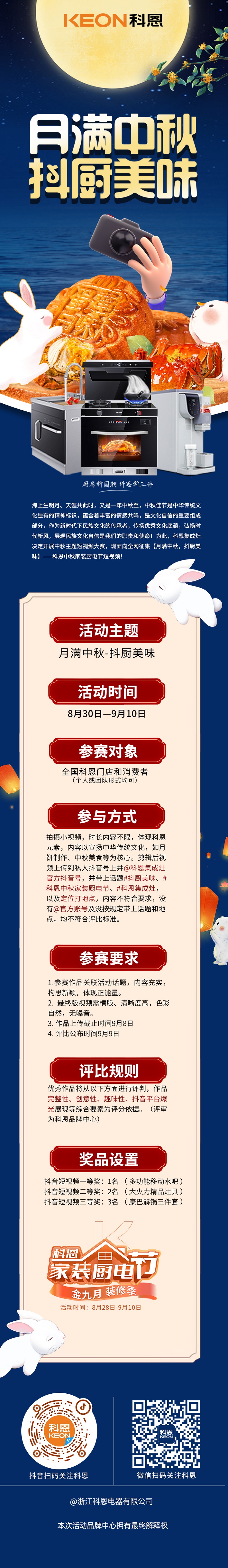 心動(dòng)不如行動(dòng)!除了1元享特權(quán)和直播大抽獎(jiǎng)活動(dòng),小科還為大家準(zhǔn)備了【月滿(mǎn)中秋,抖廚美味】科恩家裝廚電節(jié)中秋短視頻征集活動(dòng),炫酷、創(chuàng)意、戲精、腦洞、鬼馬,你想不想拍一段能“火”的視頻?拿起手機(jī),“抖”出精彩,你敢拍我就敢送!