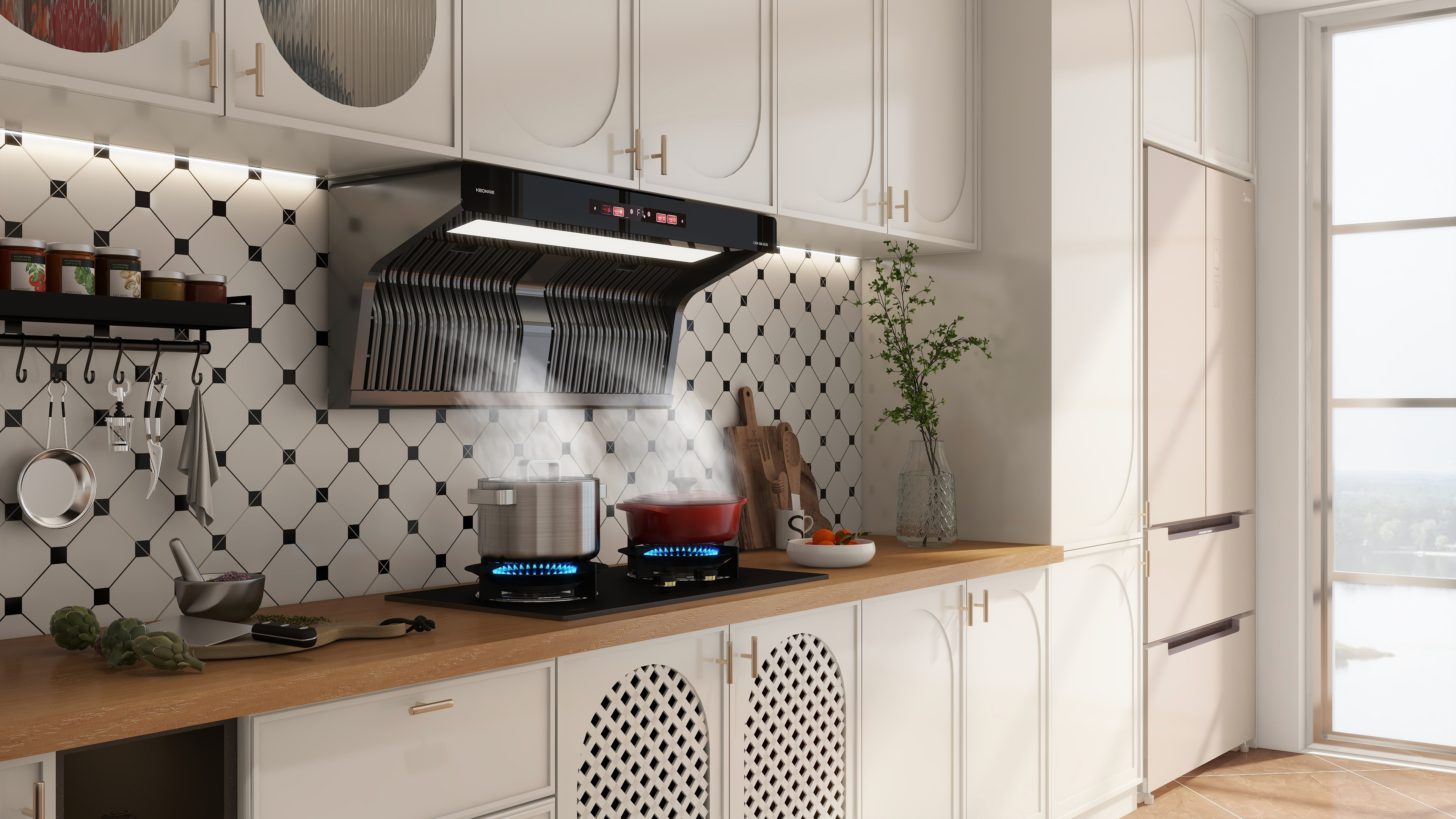 想要高品質廚房生活,還得挑選一套好廚電。科恩6530免清洗煙機搭配KN700金剛防爆灶,讓廚房生活更愜意。