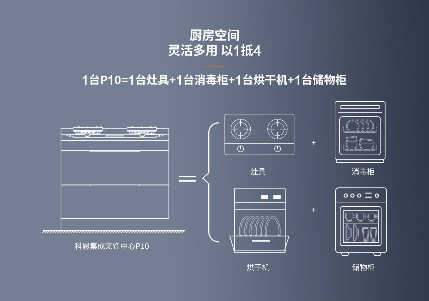 空間革命,小戶救星。告別傳統廚房束縛,解決刻板安裝限制。科恩新品集成烹飪中心p10,0.5個立方,化繁為簡。空間釋放,不占櫥柜空間;主柜清爽,不積油免清洗上烹下凈立體空間全能集成