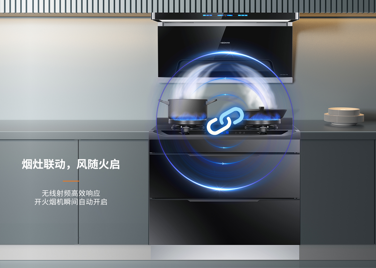 煙灶聯動,凈煙無憂免除手忙腳亂操控科恩集成烹飪中心煙灶智控互聯,開火即排煙5.2KW焰猛火系統實現快速升溫煎炒炸烙樣樣拿手廚房小白也能變身中華小當家