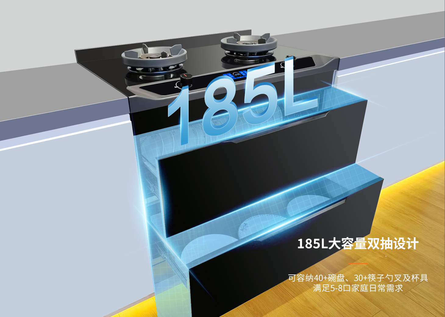 全域消殺,健康護航避免餐具二次污染,呵護全家人健康安全。科恩集成烹飪中心185L大容量消毒艙體紫外線+臭氧+紅外三重消殺奶瓶餐具統統立體滅菌二星級認證看得見的安全