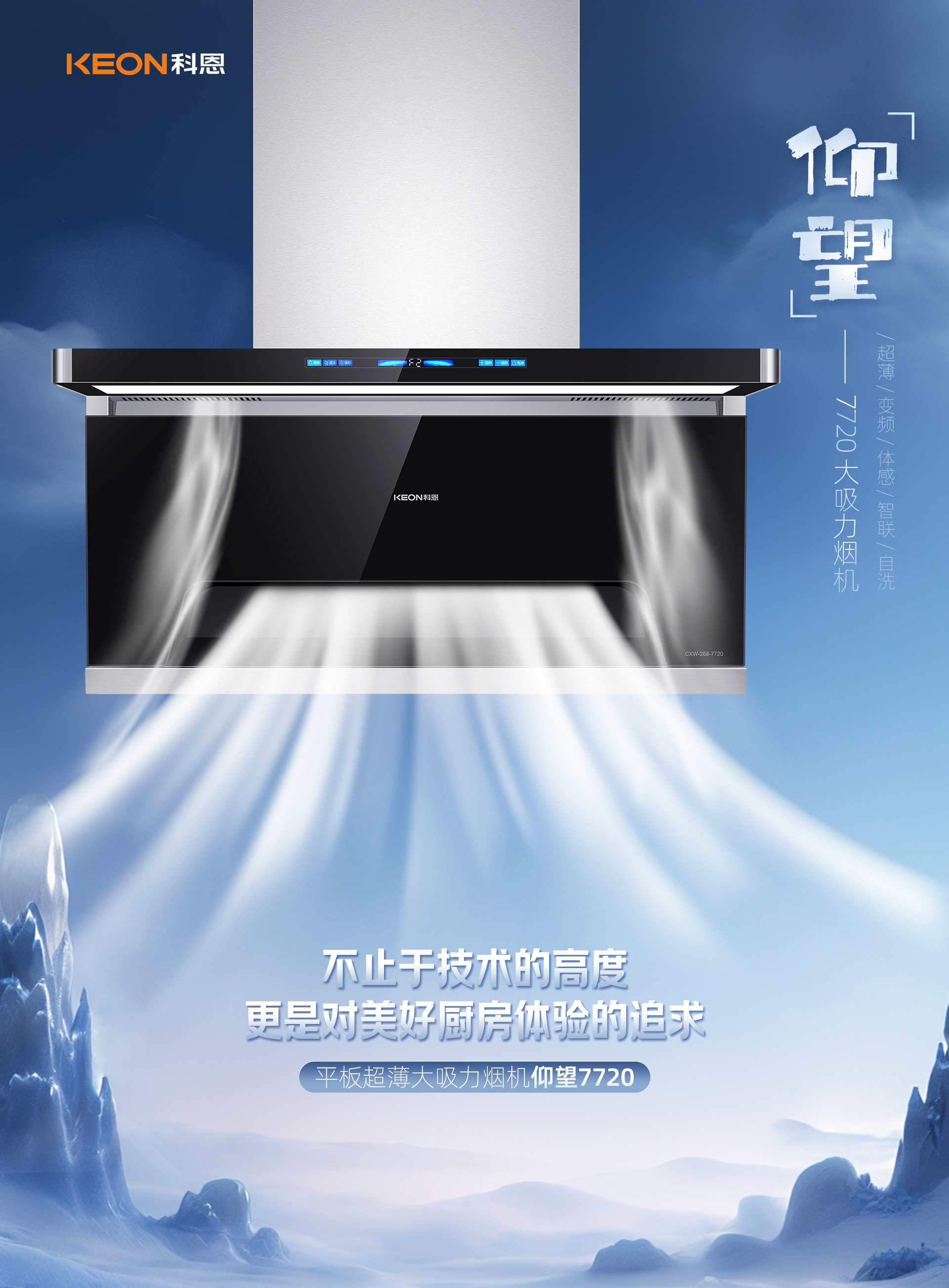 仰望7系登場,定義廚房空間新美學!895X40MM超薄靈動島設計,105°上仰纖薄前傾攏煙結構,止煙于擴散,油煙0逃逸。吸煙口負壓區內傾滑翔式設計,順勢直排,凈煙更暢快。科恩7720煙機,開啟優雅烹飪新體驗!