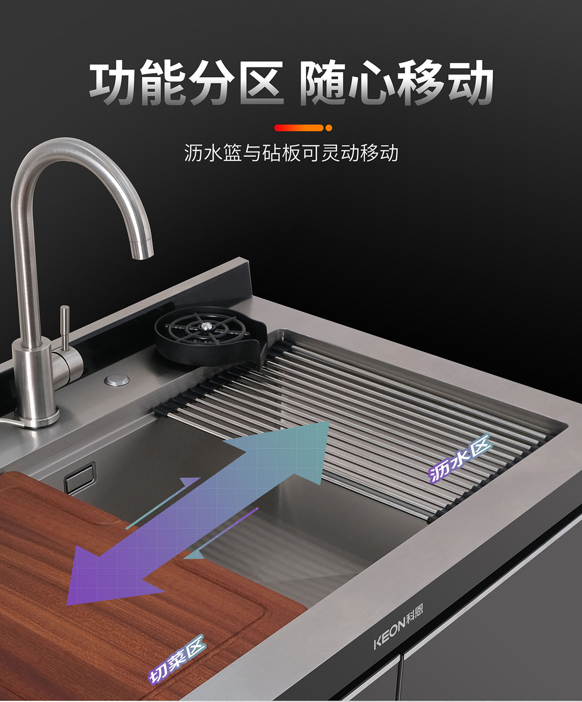瀝水籃與砧板可靈動移動,功能分區,隨心移動