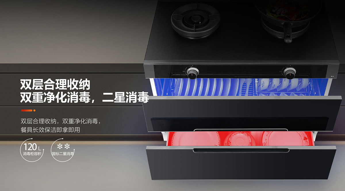 120L大容量消毒柜,采用臭氧與紫外線雙重消毒