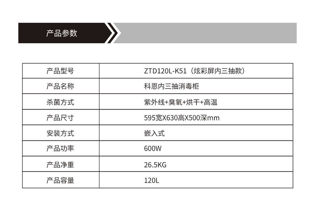 產品型號:ZTD120L-K51(炫彩屏內三抽款)產品名稱:科恩內三抽消毒柜