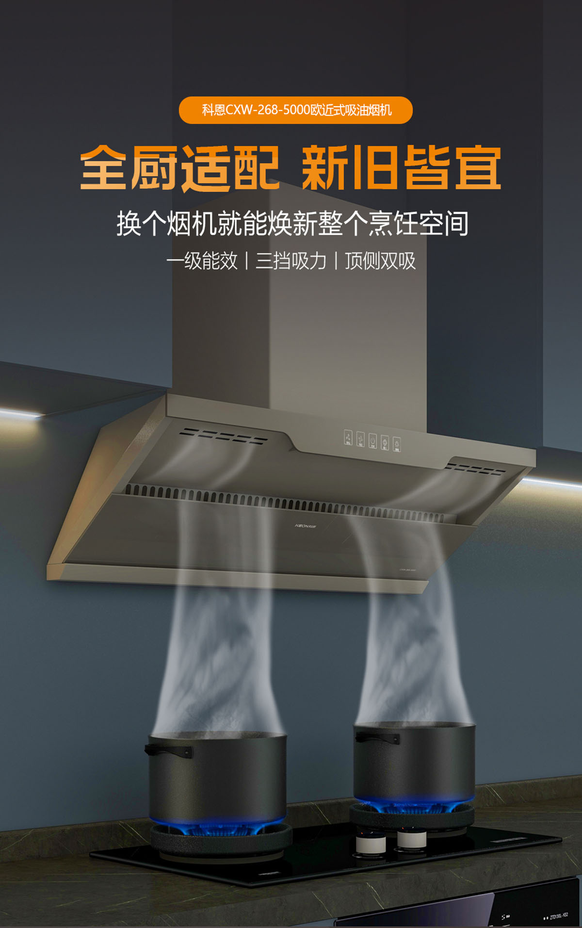 兩檔吸力+瞬吸爆炒,掌控油煙,玩轉廚房