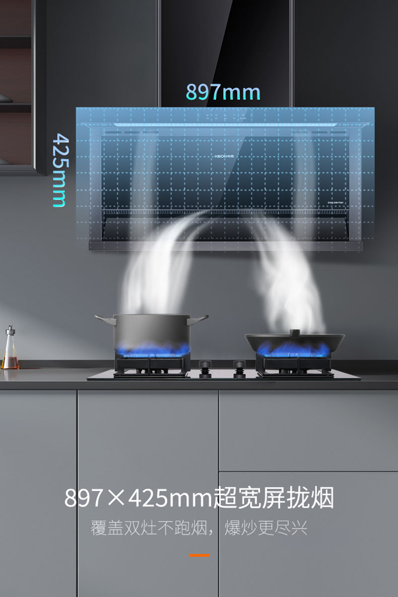 897×425mm超寬屏攏煙,覆蓋雙灶不跑煙,爆炒更盡興
